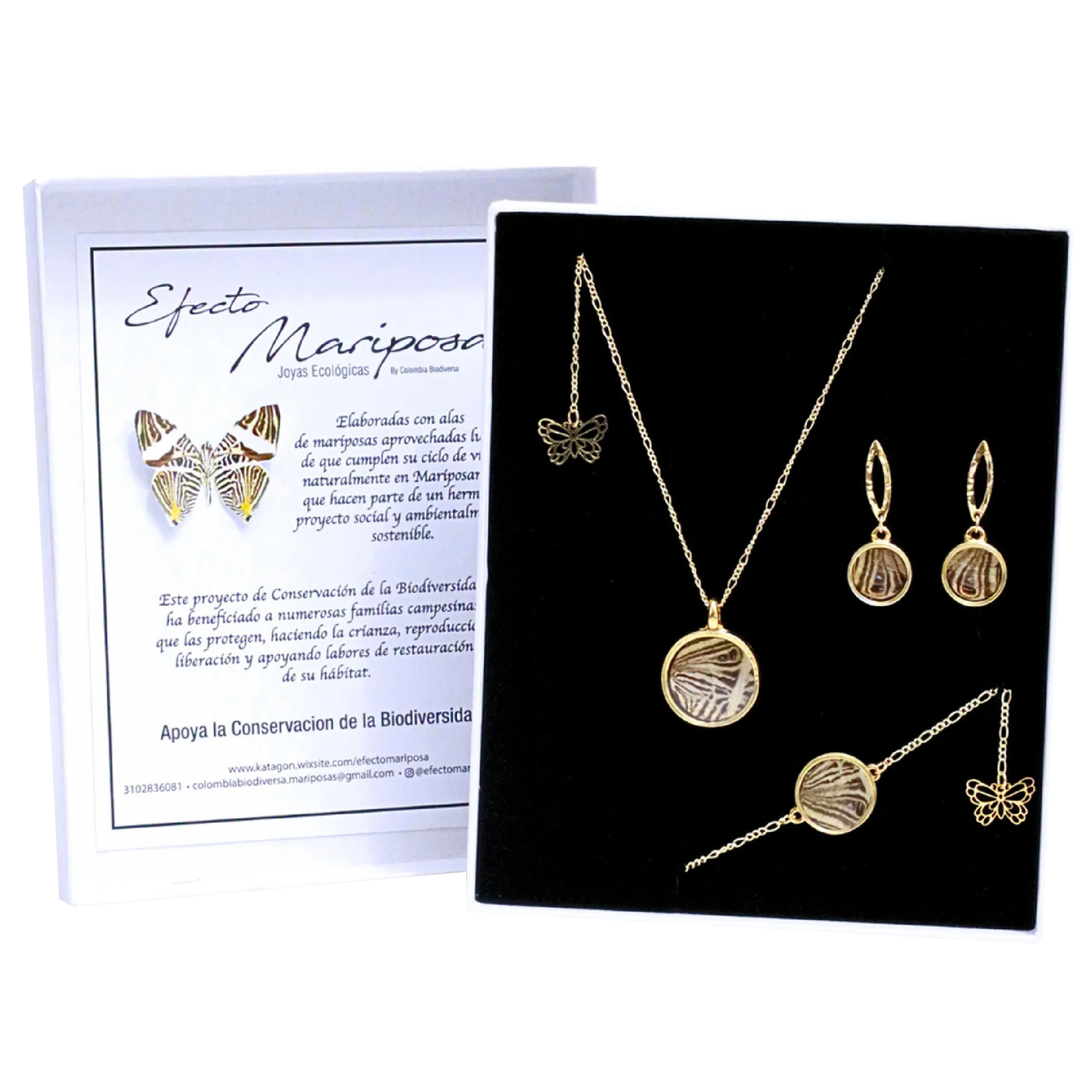 Un equilibrio perfecto entre elegancia y contraste natural. Este set, elaborado con las alas únicas de la mariposa Cebra (Colobura dirce), incluye: