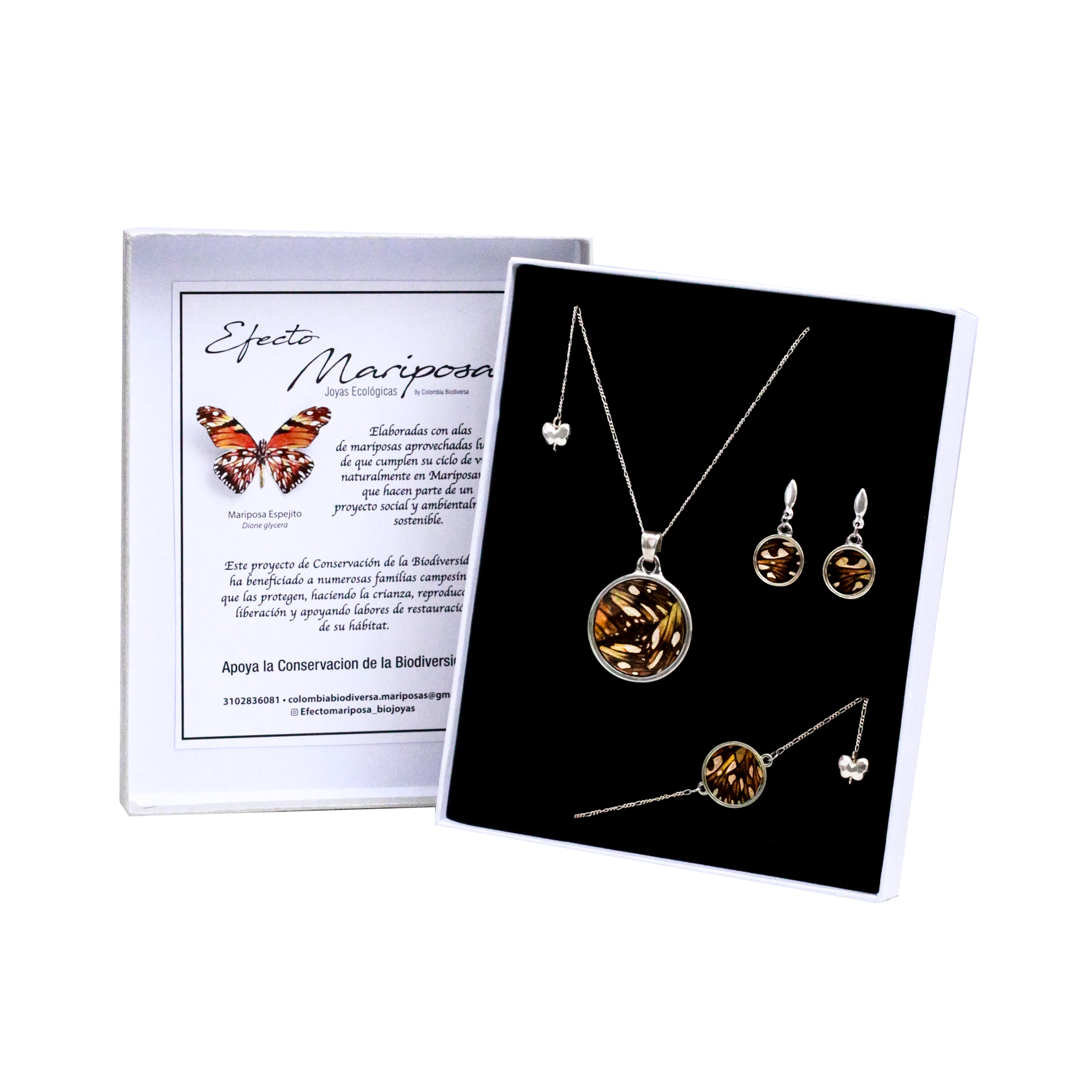 Un resplandor único que combina delicadeza y energía. Este set, elaborado con las alas plateadas y terracota de la mariposa Espejito (Dione glycera), incluye: