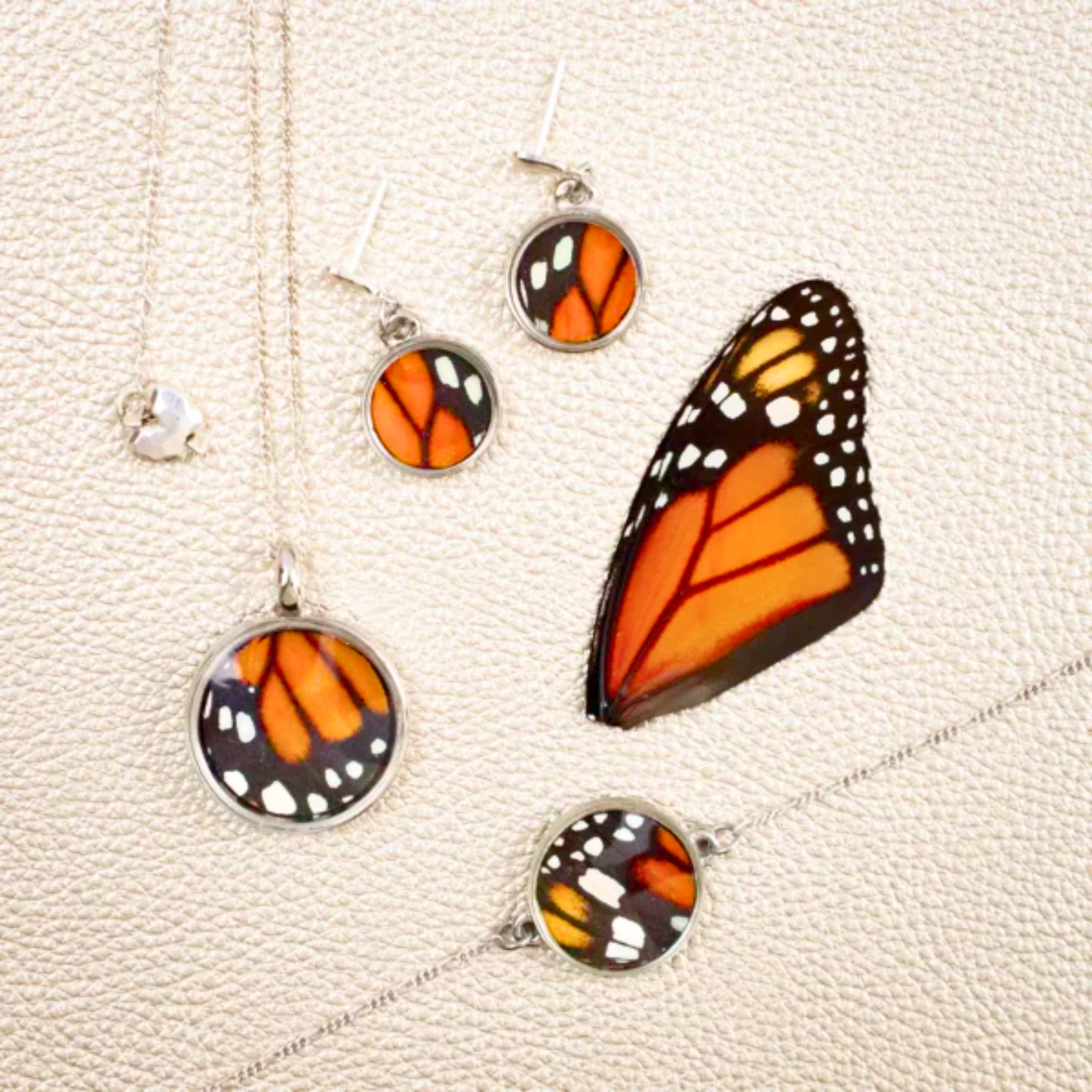 Un símbolo eterno de esperanza y transformación. Este set, elaborado con las alas vibrantes de la mariposa Monarca (Danaus plexippus), incluye: