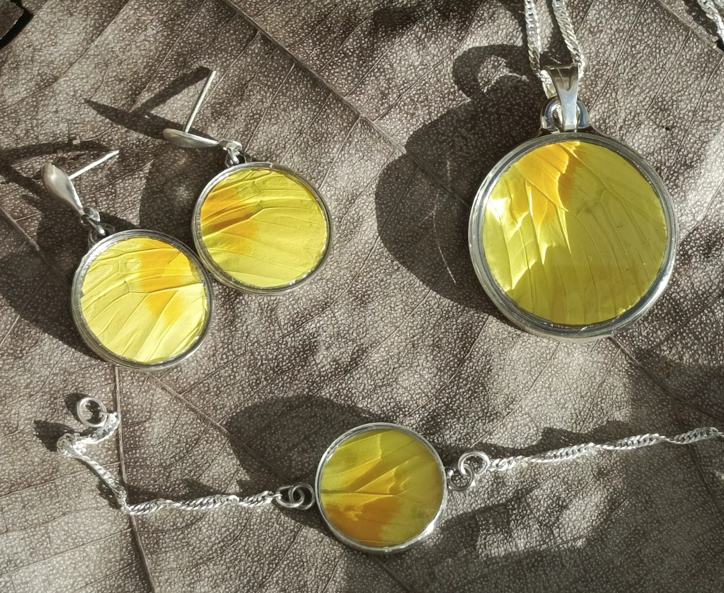 Un destello de luz y esperanza en cada detalle. Este set, elaborado con las alas vibrantes de la mariposa Sulfuro (Phoebis philea), incluye: