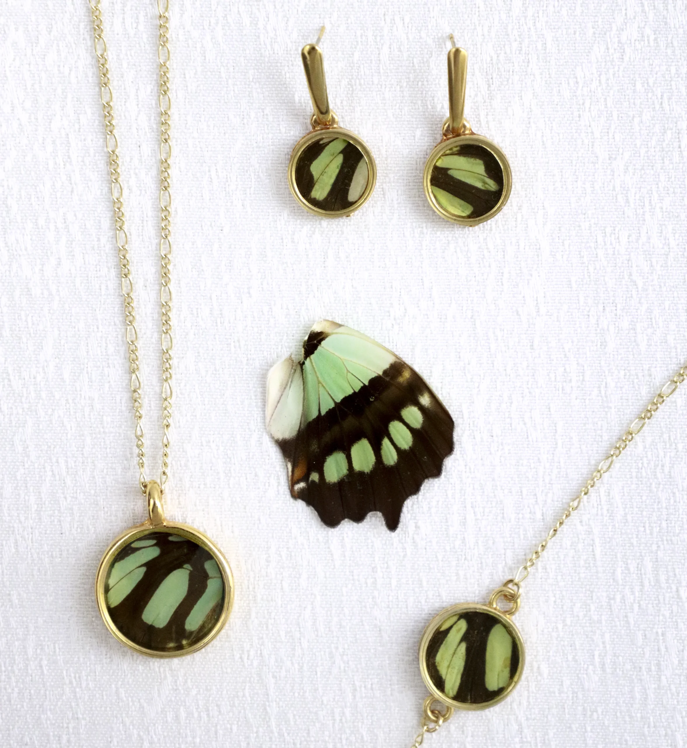 Un reflejo de frescura y de la delicadeza de la naturaleza. Este set, elaborado con las alas verdes menta de la mariposa Malaquita (Siproeta stelene), incluye: