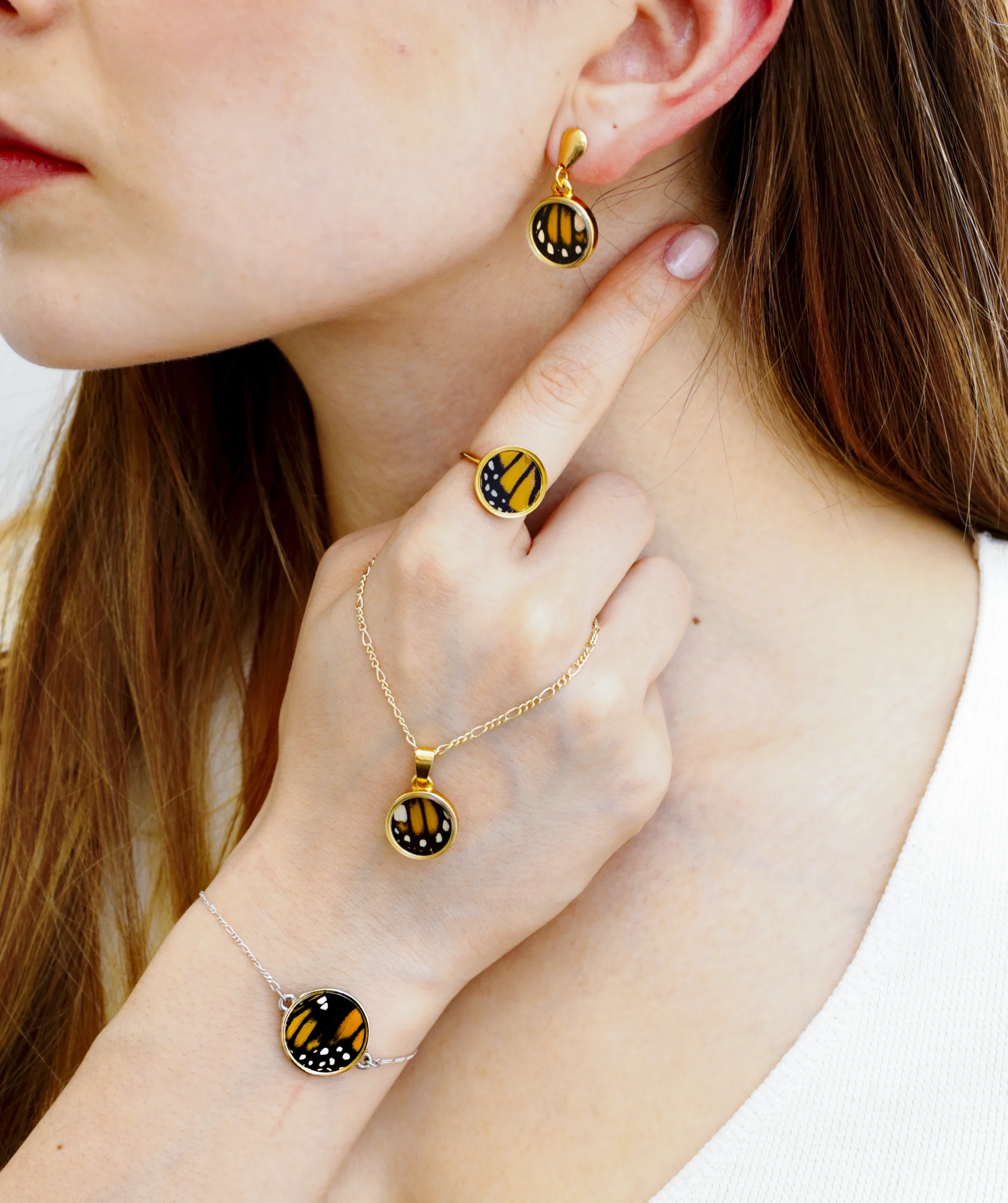 Un emblema de esperanza y transformación eterna. Este set, elaborado con las alas vibrantes de la mariposa Monarca (Danaus plexippus), incluye: